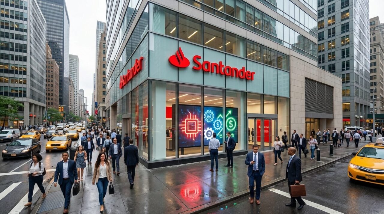 Fachada do Banco Santander com pessoas passando em frente a uma agência no centro financeiro