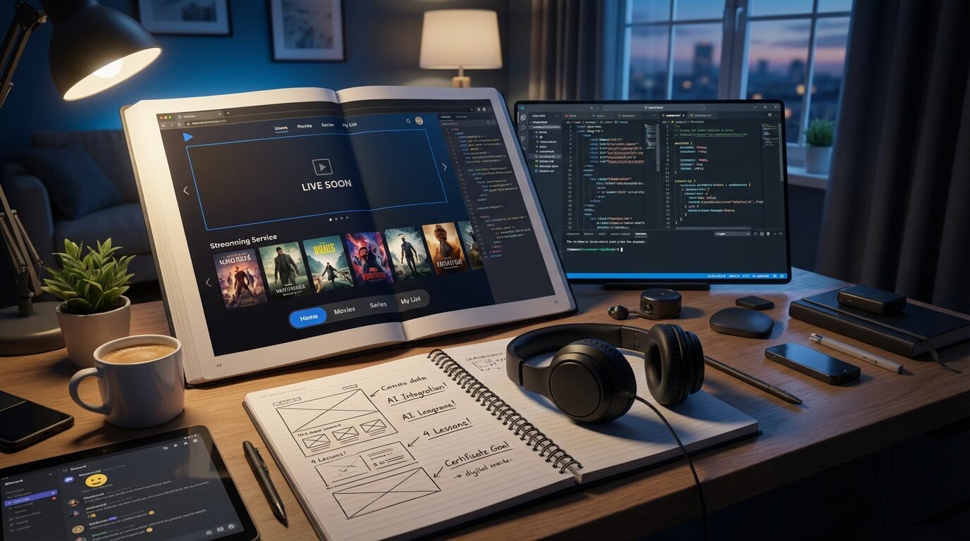 Durante a imersão, os alunos vão criar uma plataforma de streaming inspirada em serviços conhecidos como Netflix, Disney+ e Amazon Prime Video. A base técnica cobre HTML, CSS e JavaScript, com apoio de ferramentas de IA para agilizar tarefas de prototipação, revisão de código e geração de componentes.
