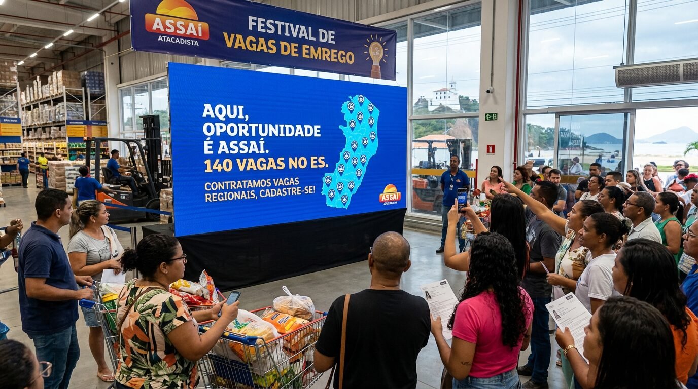 O Assaí Atacadista abriu 140 vagas de emprego no Espírito Santo e iniciou um processo seletivo com inscrição online. A informação foi divulgada por A Gazeta em fevereiro de 2026, confirmando a ampliação do quadro para operações no estado. A movimentação reforça o ritmo de contratações do atacarejo na região.