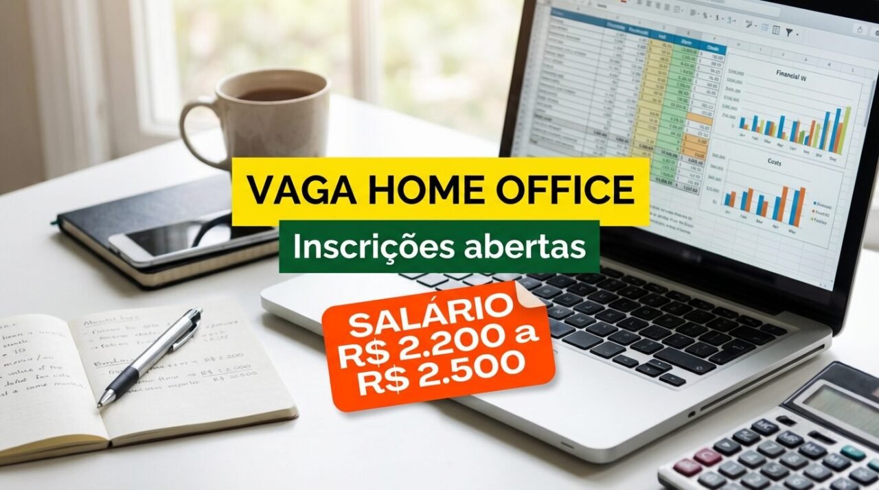 Vaga home office com CLT para assistente administrativo, salário de R$ 2.200 a R$ 2.500 e benefícios