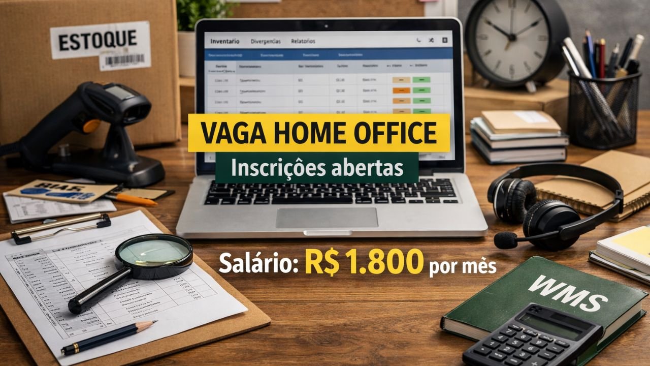 De acordo com a descrição, o trabalho é remoto e integra o time de logística, com a rotina concentrada em inventários e controle de estoque.