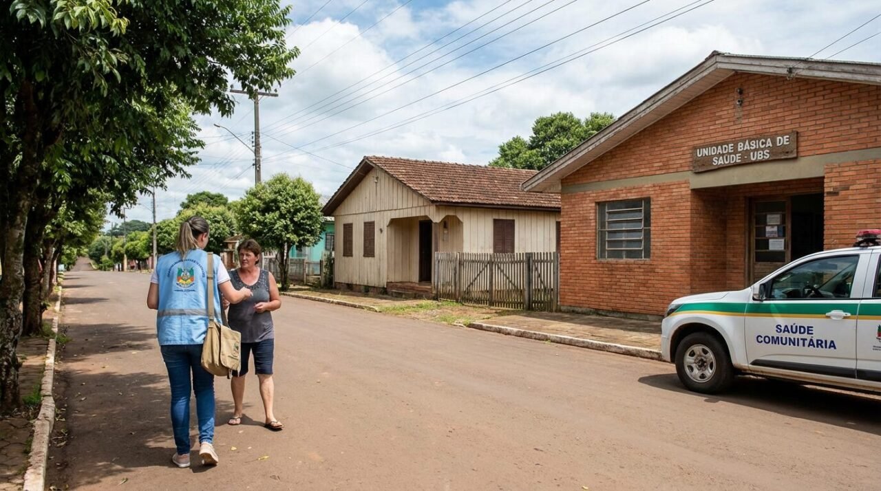 Vista de uma pequena cidade do interior do RS com unidades de saúde, retratando o contexto do processo seletivo para ACS e ACE