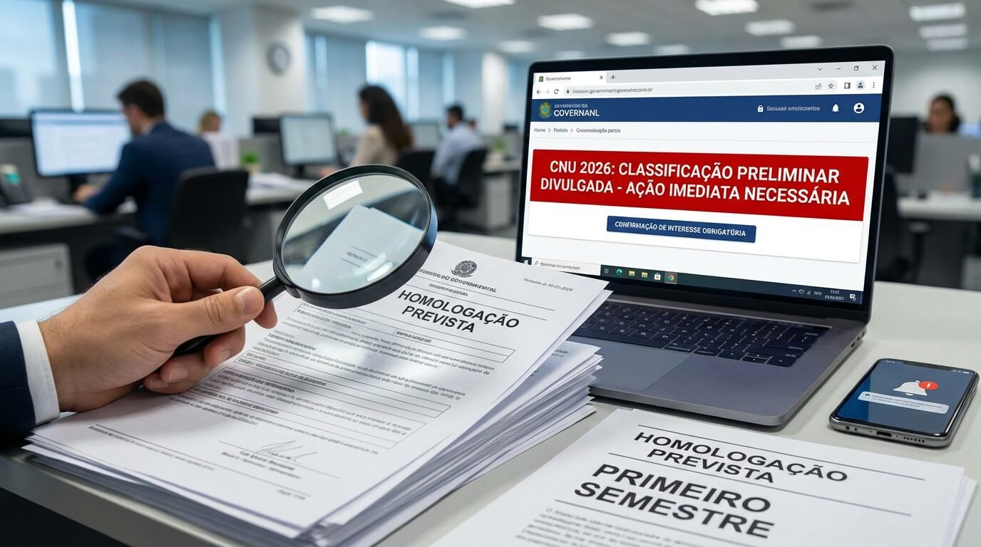 CNU 2026 tem classificação preliminar divulgada, confirmação de interesse é obrigatória e homologação final é prevista para o primeiro semestre