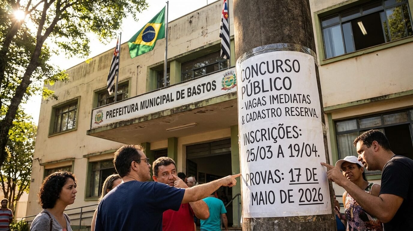 Concurso em Bastos SP abre 6 vagas imediatas e cadastro reserva com salários de até R$ 15,7 mil, inscrições entre 25 de março e 19 de abril e provas em 17 de maio de 2026