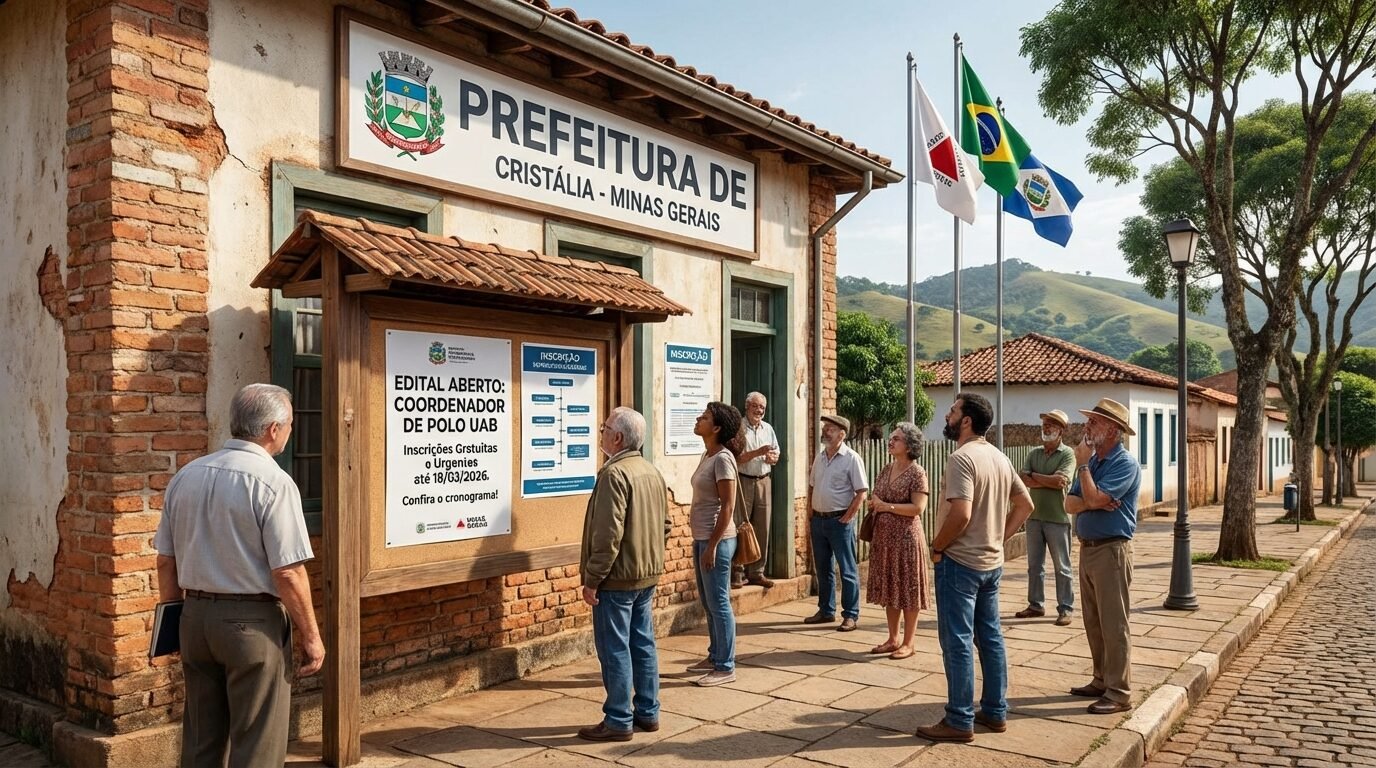 A Prefeitura de Cristália, no norte de Minas Gerais, abriu um processo seletivo simplificado para Coordenador de Polo UAB com 1 vaga. As inscrições começaram em 26 de fevereiro e seguem até 18 de março de 2026, em formato presencial na Secretaria de Educação do município.