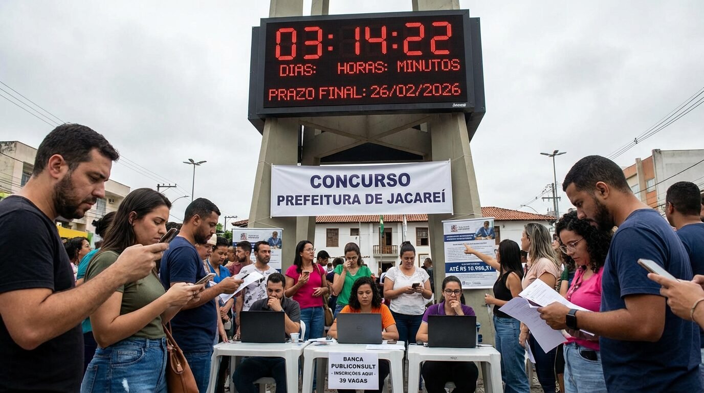 As inscrições do concurso da Prefeitura Municipal de Jacareí, no interior de São Paulo, se encerram na quinta-feira, 26 de fevereiro de 2026. O edital oferece 39 vagas imediatas para níveis médio, técnico e superior, com salários que podem chegar a R$ 10.986,31. As informações constam de matéria do jornal O TEMPO publicada em 22/02/2026 e de dados do Concurso Público Nacional Unificado.