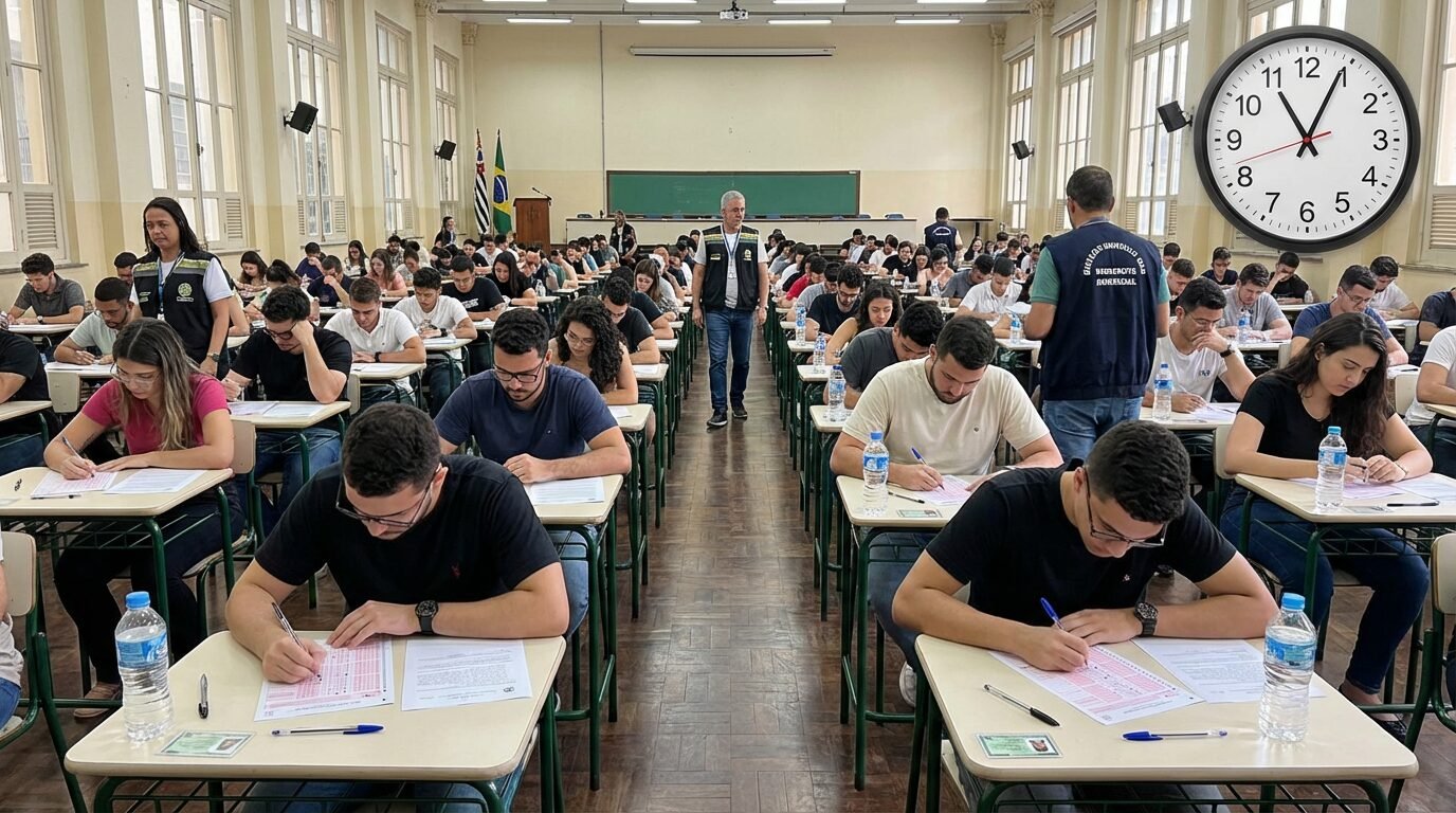 O tempo de aplicação informado foi de quatro horas, contemplando todas as instruções de sala e o preenchimento do cartão-resposta. As condições foram padronizadas nos locais de prova.