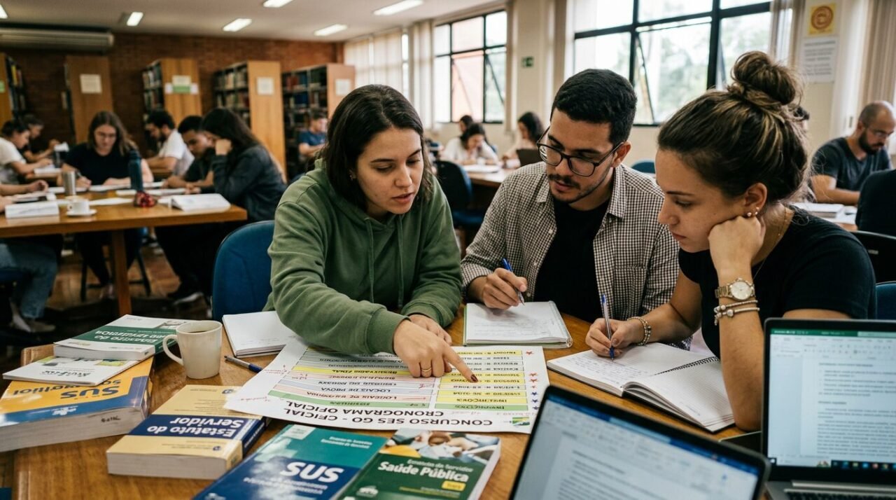 Candidatos consultando o cronograma do concurso SES GO para o cargo de Fiscal de Saúde Pública em Goiás