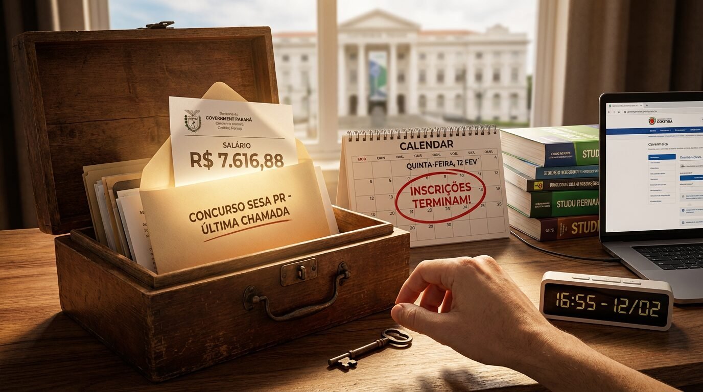 O concurso Sesa PR está na última chamada de inscrições, com término na quinta-feira, 12 de fevereiro de 2026. A seleção da Secretaria de Estado da Saúde do Paraná oferece salários iniciais de até R$ 7.616,88, conforme informado em publicação do Direção Concursos e comunicados oficiais.