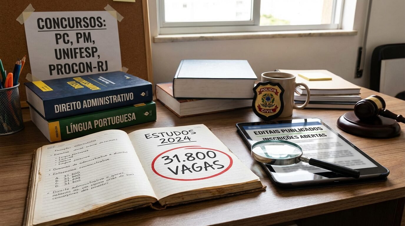 Onda de concursos com PC, PM, Unifesp e Procon-RJ abre 31,8 mil vagas no país, corrida por estabilidade cresce e prazos exigem decisão rápida