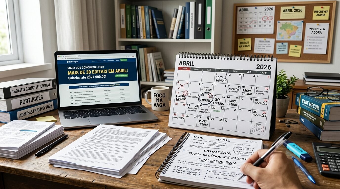 Concursos abril 2026 ganha força com mais de 30 editais no radar, salários de até R$27 mil e corrida antecipada por vagas em todo o país