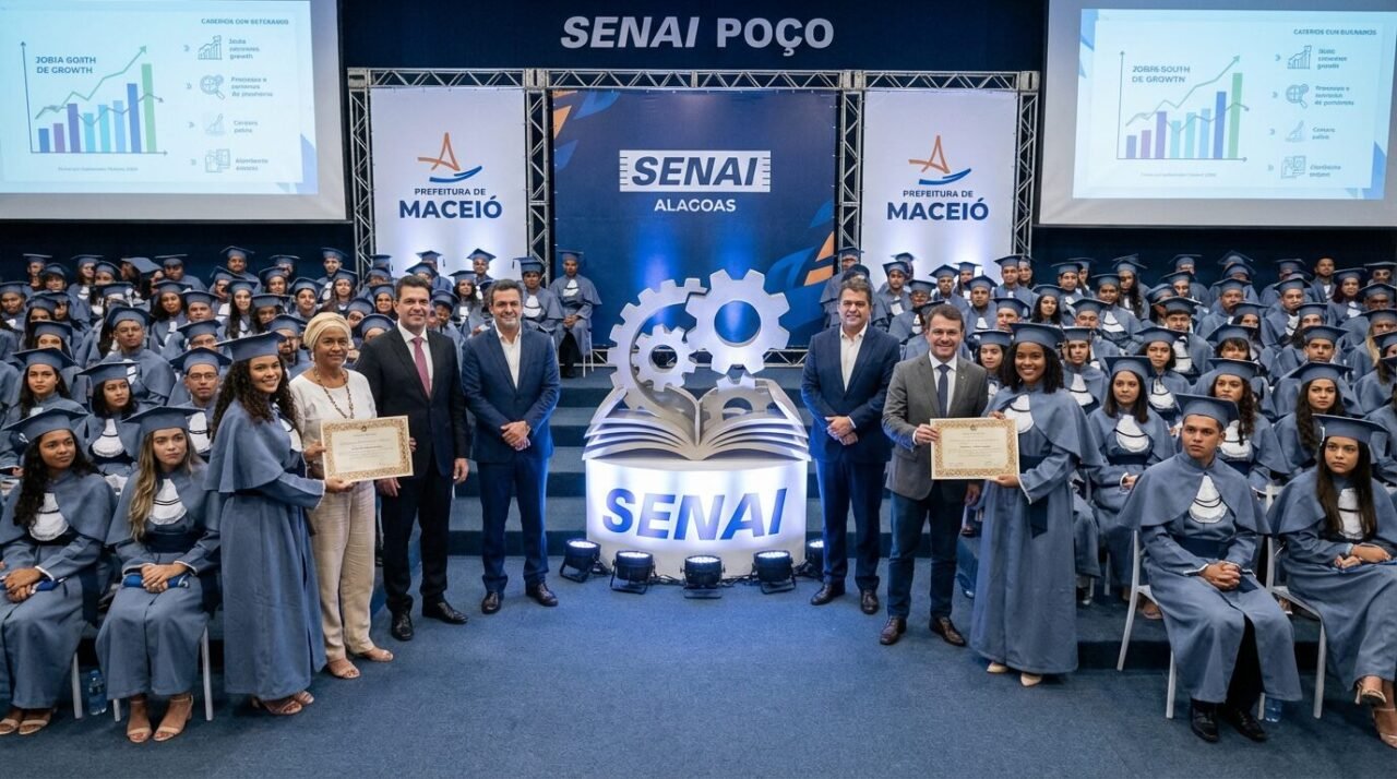 A Prefeitura de Maceió realizou a formatura de 285 alunos do Programa Emprega Jovem em cerimônia no auditório do SENAI Poço, na quarta-feira (25). O evento contou com a presença do prefeito JHC e da primeira-dama Marina Candia, marcando a conclusão de mais uma etapa de qualificação profissional. De acordo com a Prefeitura de Maceió, a ação integra as políticas públicas voltadas à empregabilidade juvenil na capital.