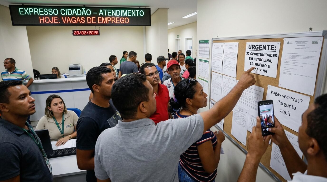 A Agência do Trabalho de Pernambuco informou a abertura de 32 vagas distribuídas entre Petrolina, Salgueiro e Araripina, nesta sexta-feira, 20 de fevereiro de 2026. As oportunidades foram divulgadas em comunicado acompanhado pela cobertura do g1 Petrolina, que reforça a atualização diária dos postos disponíveis.