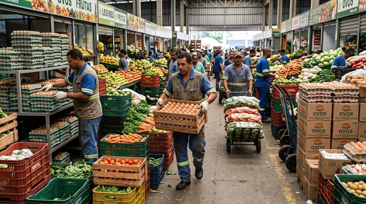 Trabalhadores em centro de abastecimento de Minas Gerais com caixas de ovos e movimentação de mercadorias