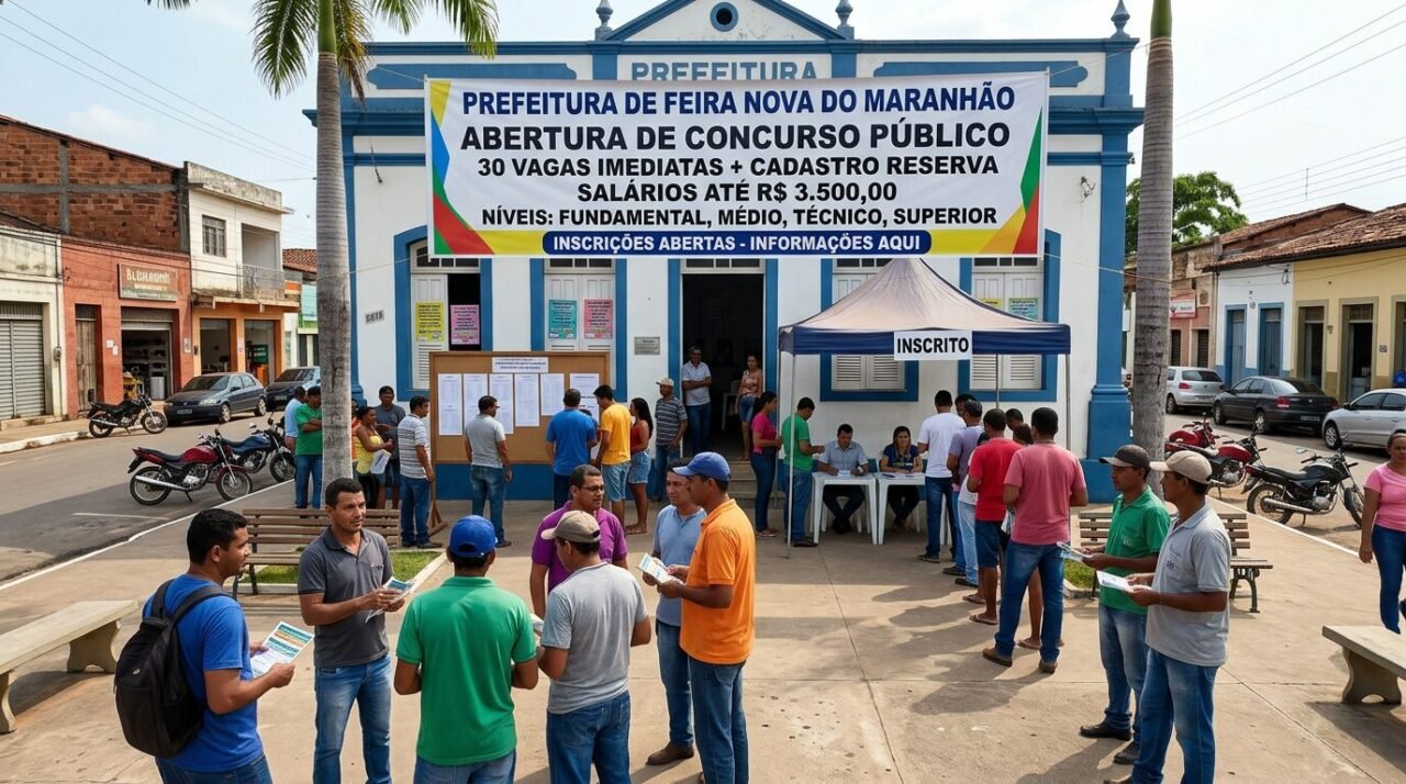 A Prefeitura de Feira Nova do Maranhão, no Maranhão, publicou edital de concurso público com 30 vagas imediatas e formação de cadastro reserva. A seleção contempla cargos para candidatos com escolaridade de níveis fundamental, médio, técnico e superior completo.