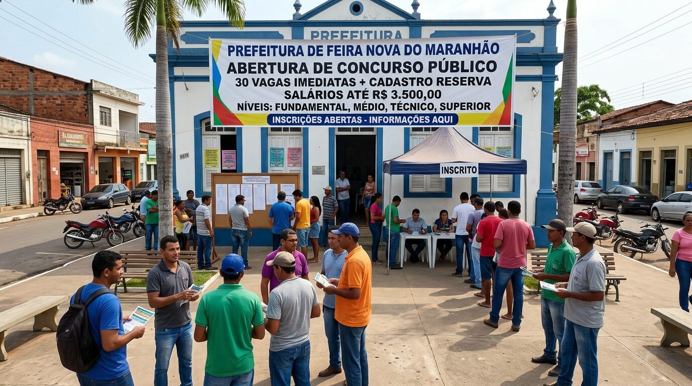Feira Nova do Maranhão abre concurso com 30 vagas, cadastro reserva e salários de até R$ 3,5 mil para vários níveis de escolaridade