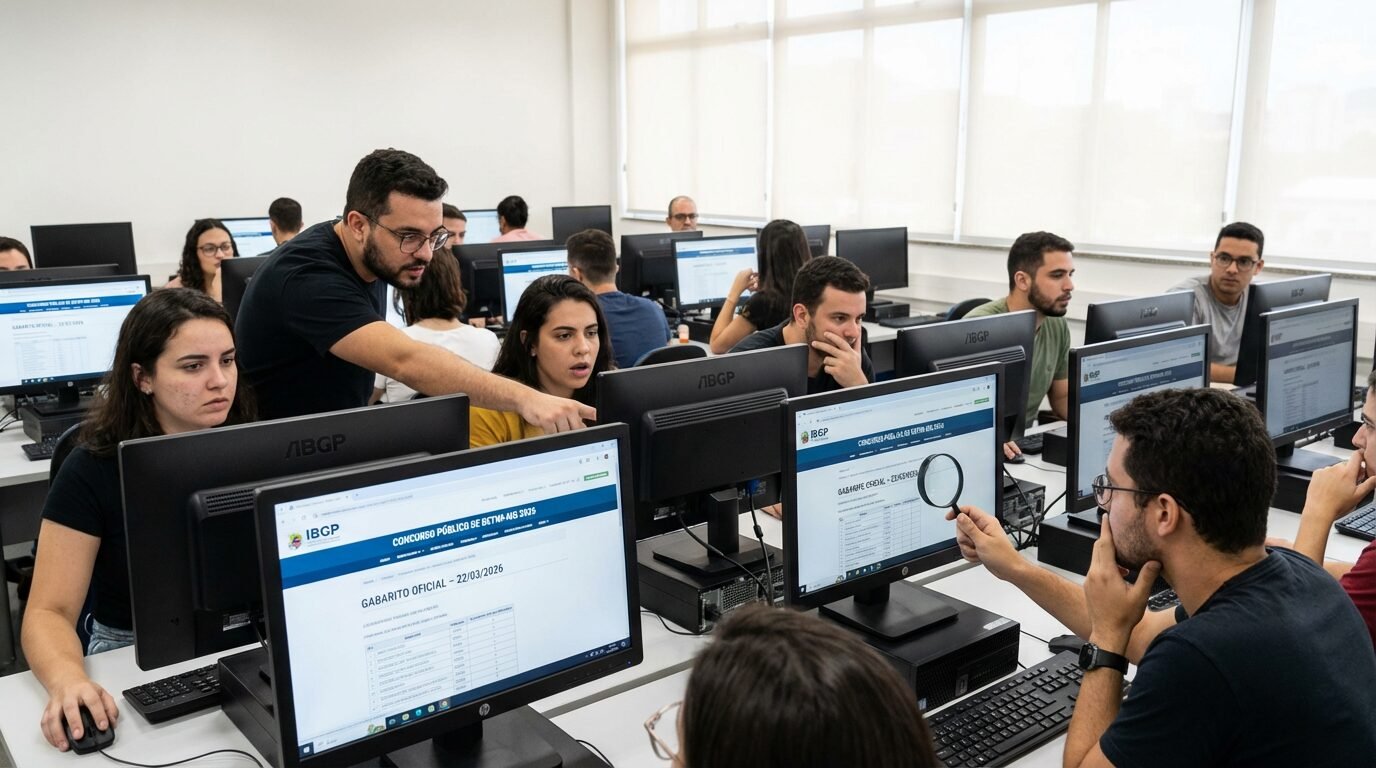 Candidatos acessam o gabarito preliminar do concurso de Betim-MG 2026 no site do IBGP em computadores