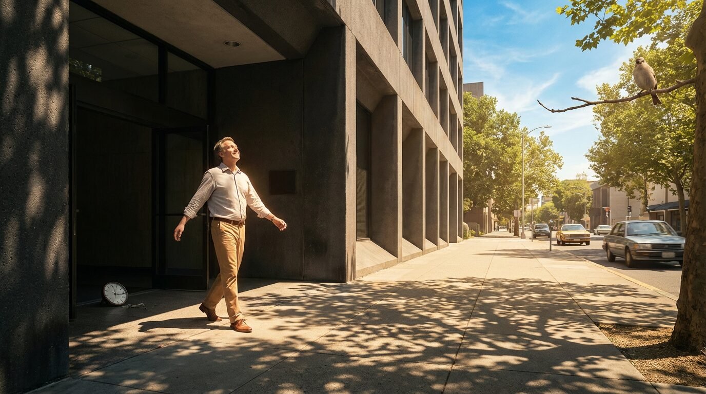 Pessoa deixa o escritório e caminha na calçada sob sol ameno, respirando fundo e sorrindo