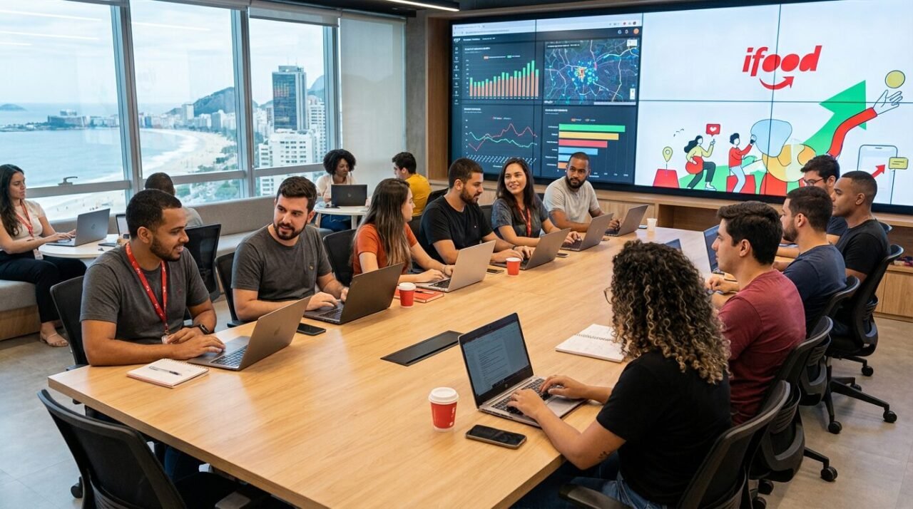 Profissionais no escritório do iFood em reunião de tecnologia, representando processo seletivo em São Paulo e Rio de Janeiro