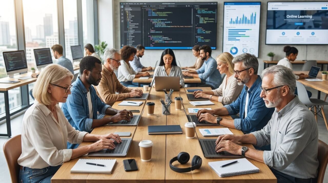 Profissionais estudando em notebooks durante curso online de tecnologia em um espaço de coworking