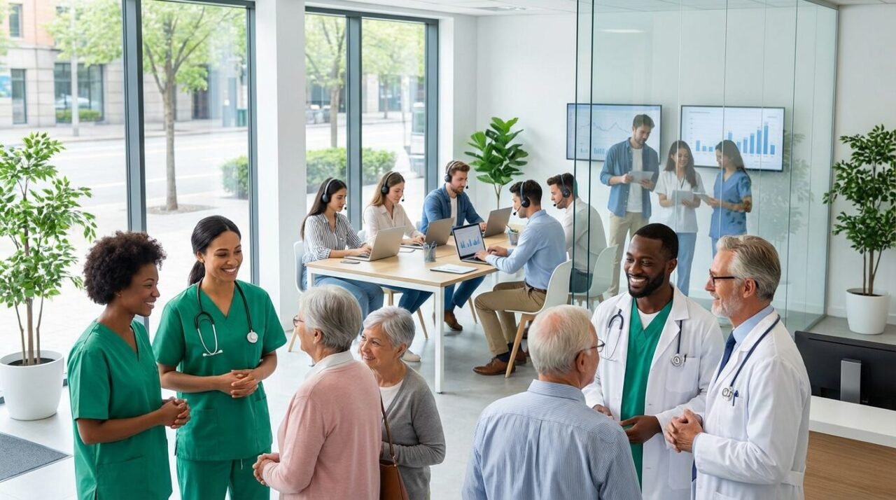 Profissionais de saúde e tecnologia em unidade da MedSênior durante atendimento e suporte administrativo