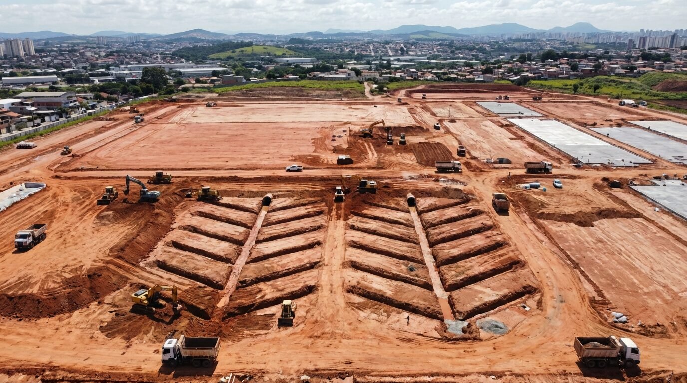 Antes de erguer pilares e vigas, a etapa crítica é a estabilização do solo. O terreno argiloso recebe drenagem subsuperficial em desenho de “espinha de peixe”, com ramificações que captam a umidade e a conduzem a um tronco principal. As valas são forradas com manta geotêxtil, que filtra sedimentos, envolvendo tubos perfurados e brita para manter o sistema ativo sem entupimentos.