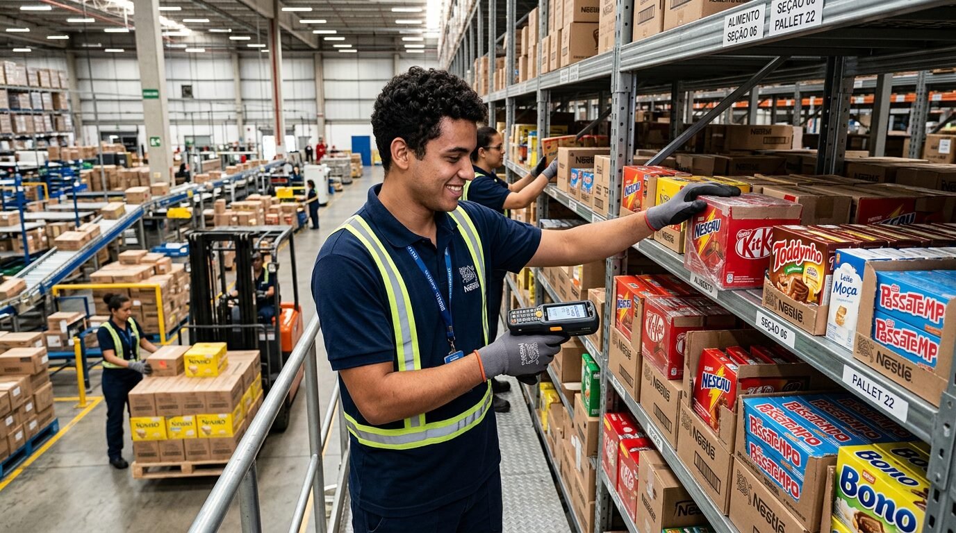 Profissional em centro de distribuição separando mercadorias em operação ligada a vagas de emprego da Nestlé no Brasil