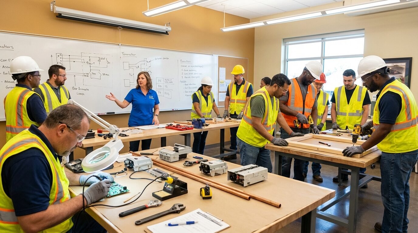 Sala de aula em Roca Sales com adultos em curso profissionalizante participando de atividade prática com instrutor