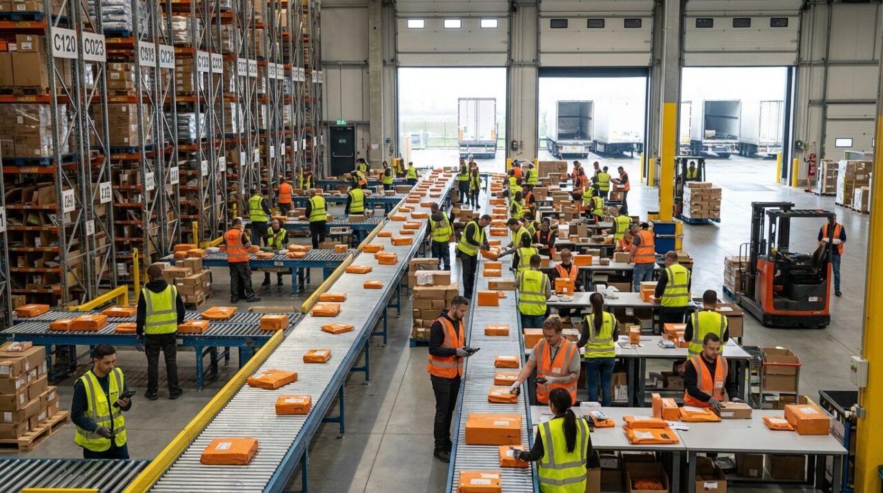 Centro logístico da Shopee no Brasil com colaboradores organizando pacotes em esteiras