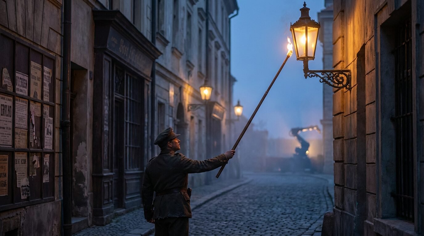 O acendedor de lampiões percorria as ruas para acender e apagar manualmente as luzes públicas a óleo ou gás. A cena, hoje nostálgica, marcou o cotidiano de cidades europeias e latino-americanas antes da eletrificação plena.