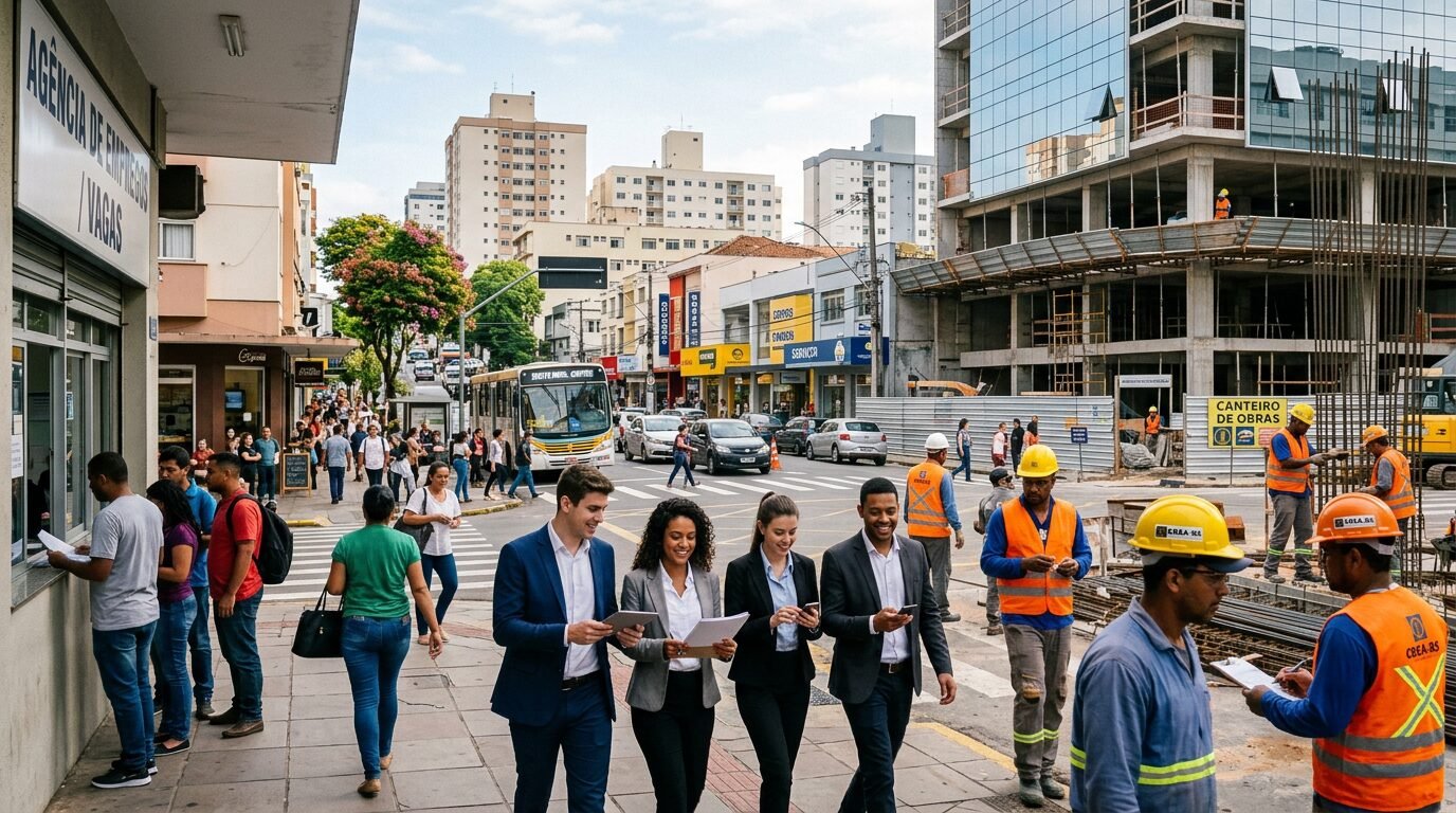 Movimento em área urbana de Santa Maria com trabalhadores e comércio local, representando a reação na geração de empregos formais