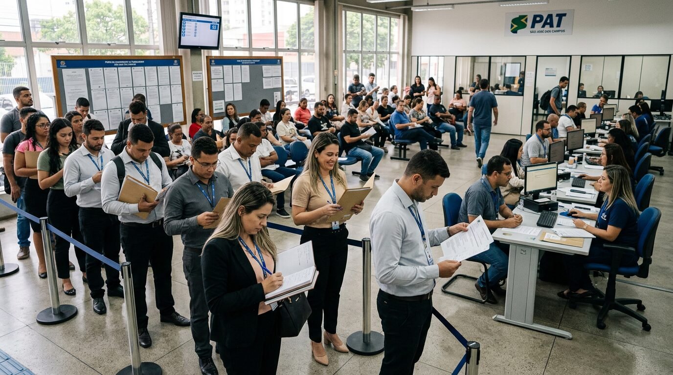 Fachada ou atendimento do PAT de São José dos Campos com destaque para vagas de emprego abertas na cidade