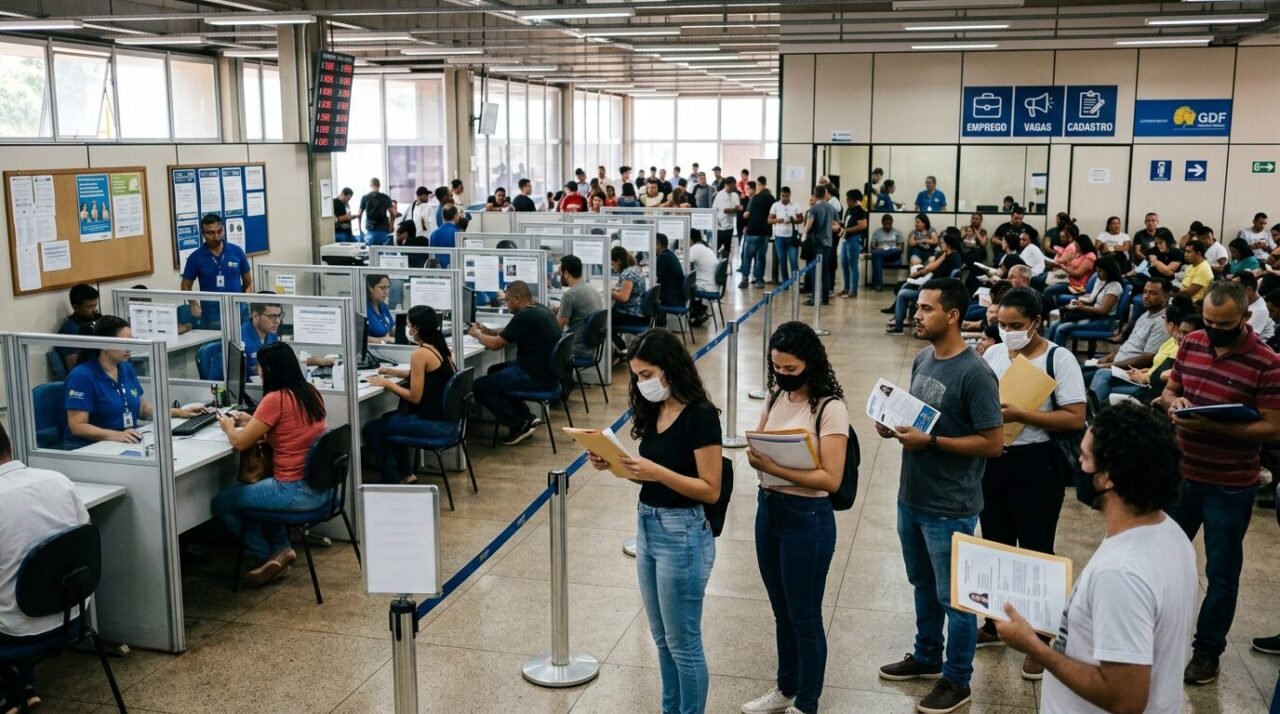 Movimento em agência do trabalhador do Distrito Federal com painel de atendimento e pessoas buscando vagas de emprego