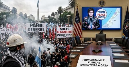 Milei viaja aos EUA, participa em Washington do conselho de paz criado por Trump e oferece tropas para Gaza enquanto a Argentina enfrenta greve geral