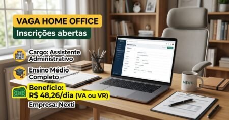 Home office com ensino médio e vale de R$ 48,26 por dia coloca vaga de assistente administrativo da Nexti entre as mais atraentes do momento 31 de março de 2026 - Ana Paula Araújo Home Office