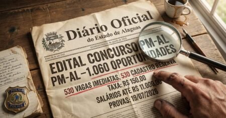 Edital do concurso da PM-AL abre 1.060 oportunidades entre oficiais e praças, com taxa de R$ 150 e salários de até R$ 11 mil em 2026 20 de março de 2026 - Ana Paula Araújo Concursos Públicos