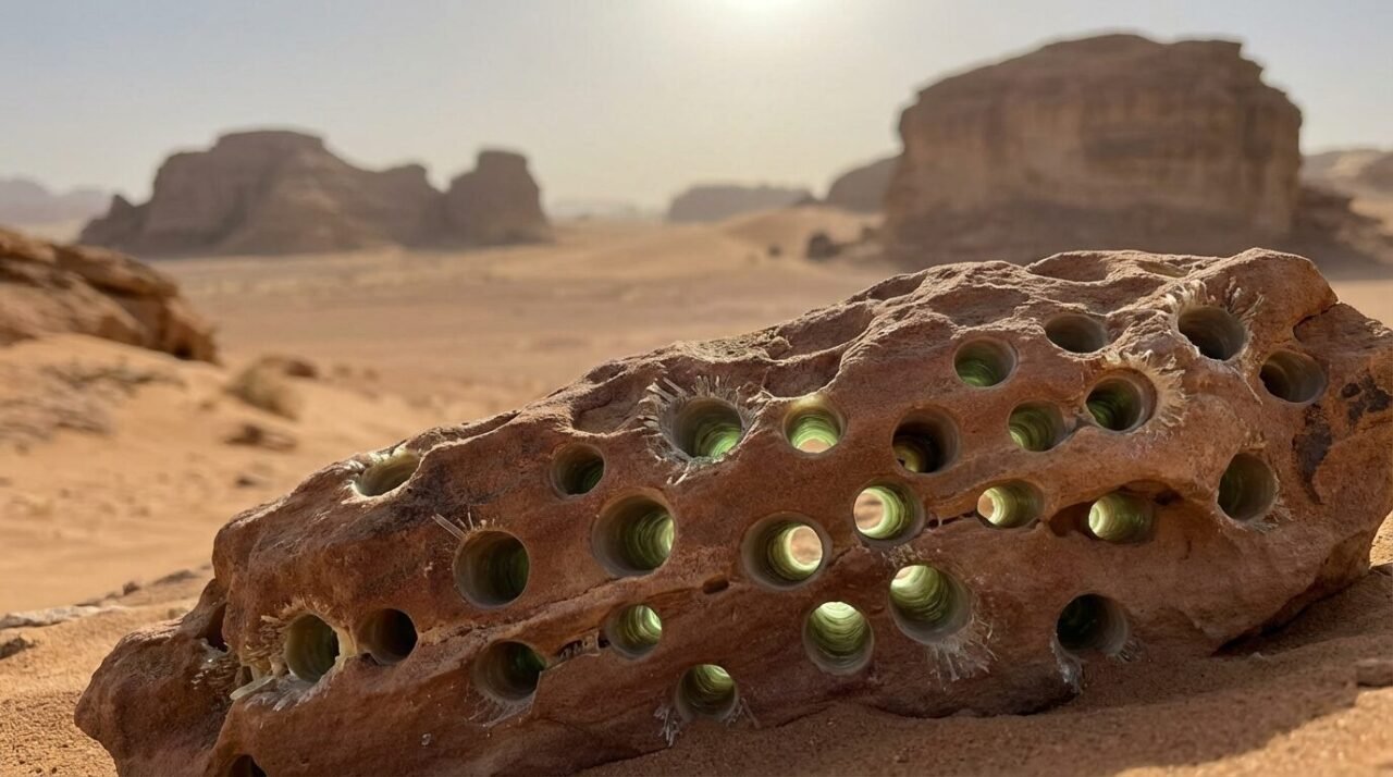 Em desertos africanos e árabes, geólogos relatam túneis microscópicos com padrão geométrico inusitado em mármores e calcários. As estruturas, alinhadas e profundas, não batem com processos físicos conhecidos e sugerem atividade biológica antiga.