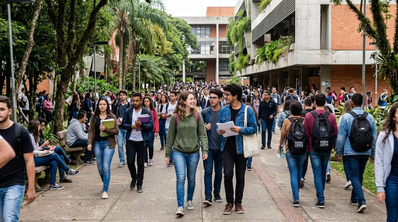 Entrada de universidade com estudantes circulando para atividades de cursos de idiomas da UFPR