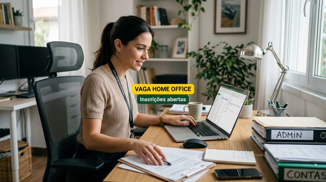 Vaga de auxiliar de escritório home office reúne rotina administrativa, suporte interno e perfil organizado para trabalho remoto