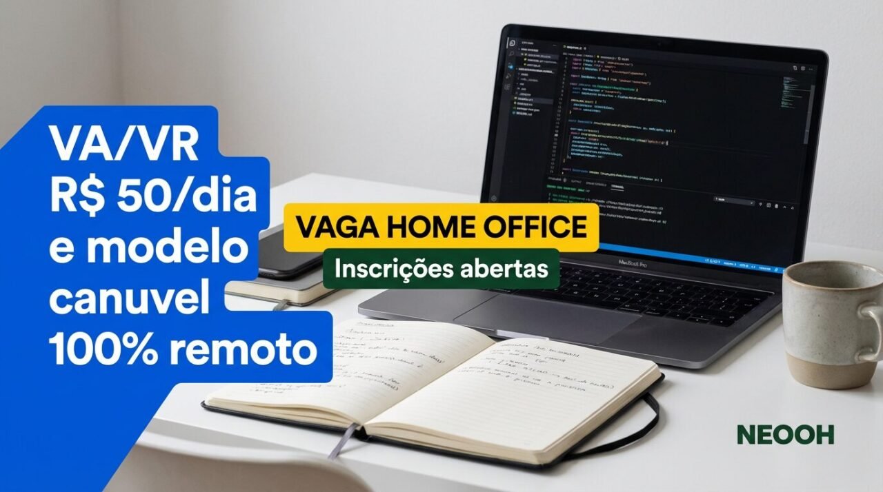 A NEOOH abriu vaga home office para assistente de desenvolvimento em regime tempo integral e com modelo 100% remoto. O anúncio destaca benefícios competitivos, com VA ou VR de R$ 50 por dia útil e plano de saúde nacional, além de outros atrativos.
