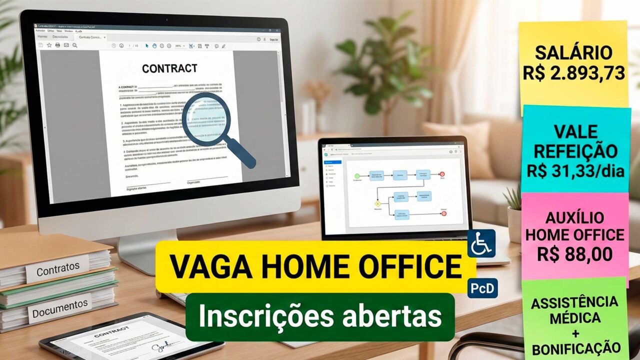 Entre os pontos que chamam atenção, a empresa informa salário de R$ 2.893,73, além de vale refeição diário e auxílio home office. A vaga também menciona assistência médica e bonificação conforme avaliação.