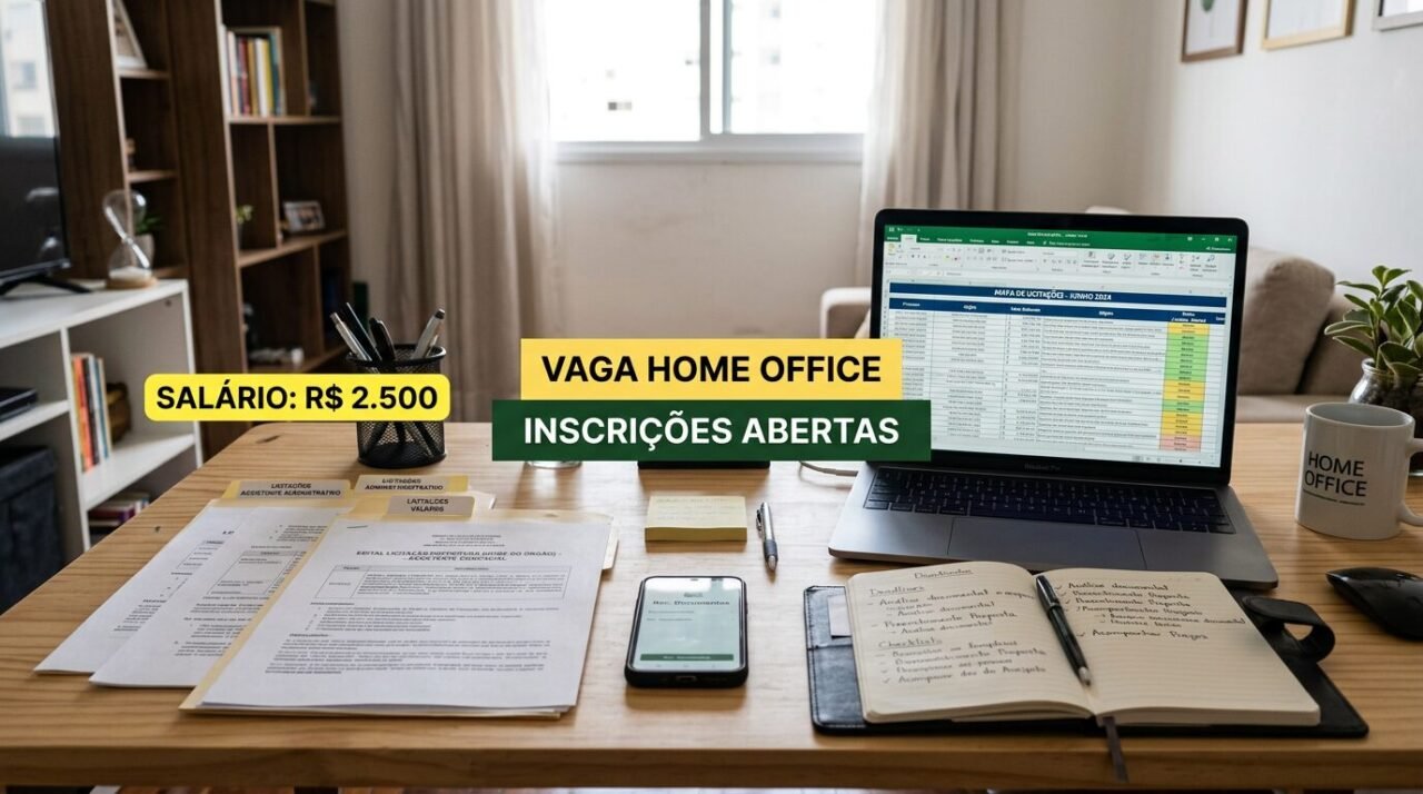 Vaga home office paga R$ 2.500 e aceita ensino médio para assistente administrativo comercial com foco em licitações