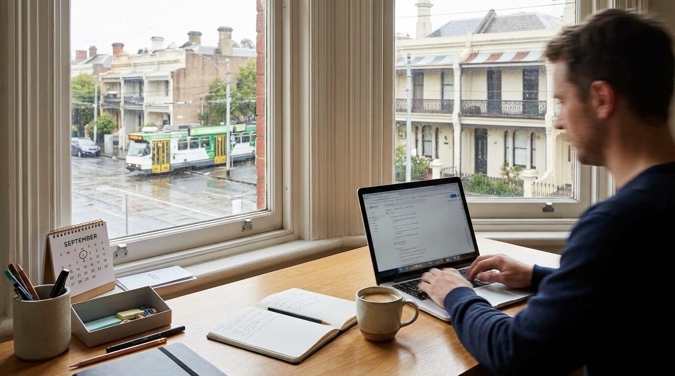Profissional trabalhando em home office com notebook sobre a mesa, ambiente doméstico iluminado em Melbourne, Austrália